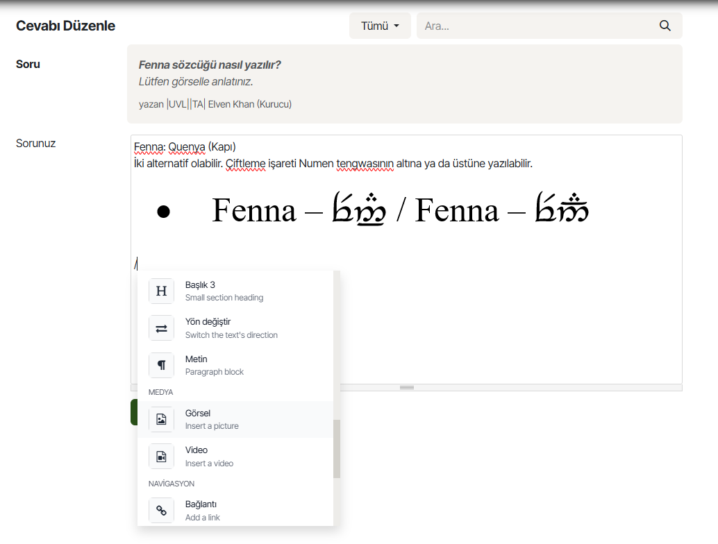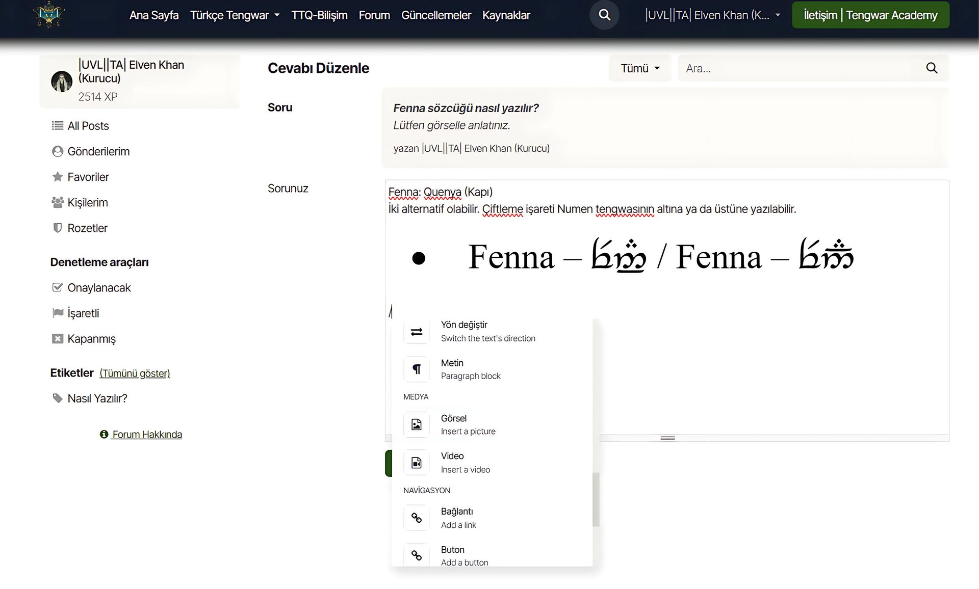 - Soru açıklamanızda Tengwar kullanmanız gerektiğinde bunu görsel paylaşarak yapmanız gerekmektedir. Bu görsellerin beyaz fon üzerine siyah Tengwar yazısı şeklinde olması tercih edilmelidir. Bu işlemi sitemizin "Hesabım" sekmesinde bulunan "Tengwar Yazı Alanı" bölümünde yazarak ya da kendi Microsoft Word programınızda Tengwar ile yazdıktan sonra ekran görüntüsü alıp kaydederek yapabilirsiniz (ekranın bir kısmını görsel olarak kaydetmek için windows + shift + S düğmelerine basınız). Açıklama metninde görsel paylaşmanın iki farklı yöntemi bulunmaktadır.